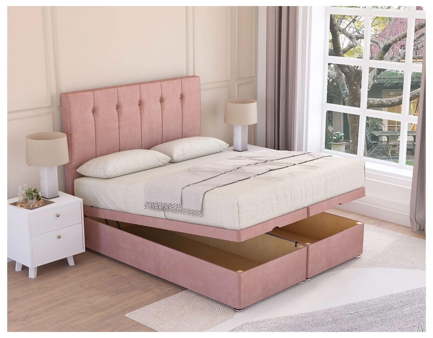 PLUSH VELVET STORAGE OTTOMAN DIVAN BED (SIDE-LIFT) + FLORENCE WINGED FLOOR STANDING HEADBOARD.